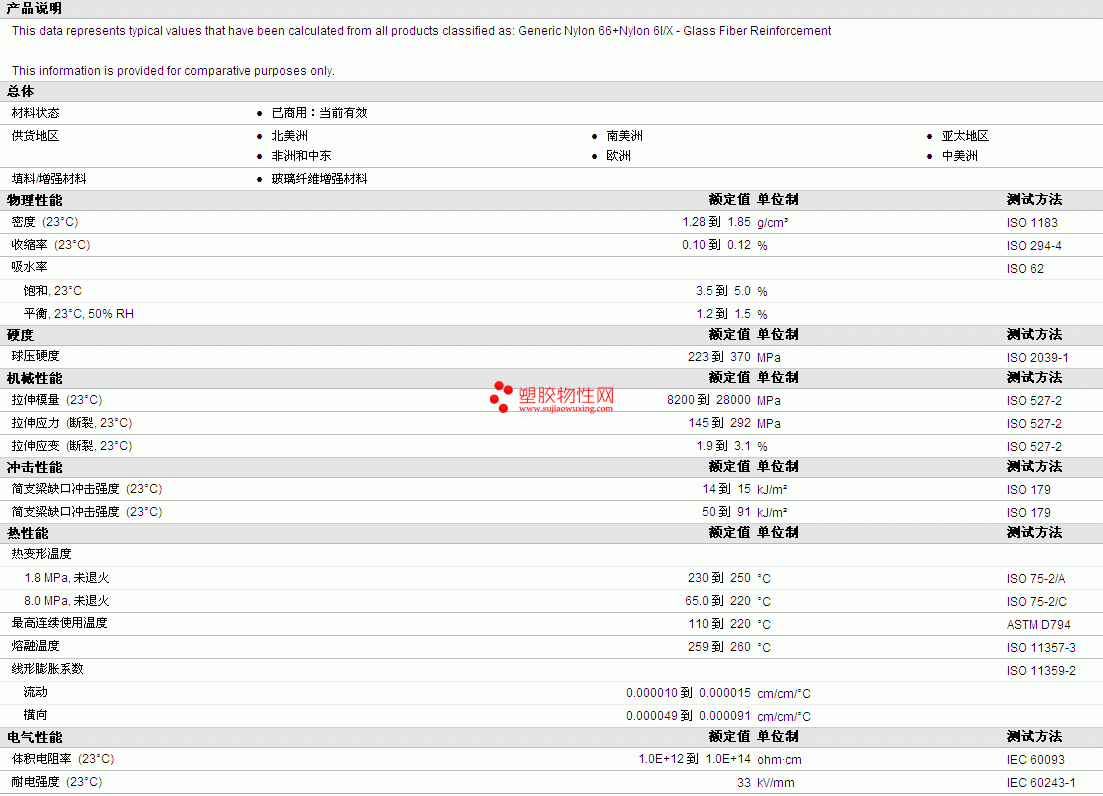 Generic Nylon 66+Nylon 6I/X - Glass Fiber Reinforcement物性表详情见附件