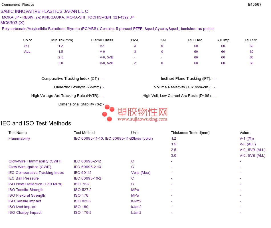 Polycarbonate/Acrylonitrile Butadiene Styrene (PC/ABS) MC5303 (X)UL黄卡资料请登陆会员后查看,如需电子档资料,请联系客服! 赵生:手机13424755533;QQ:27660005