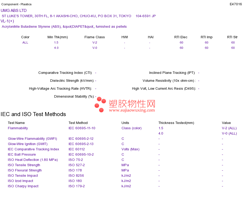 Acrylonitrile Butadiene Styrene (ABS) VL-1(+)UL黄卡资料请登陆会员后查看,如需电子档资料,请联系客服! 赵生:手机13424755533;QQ:27660005