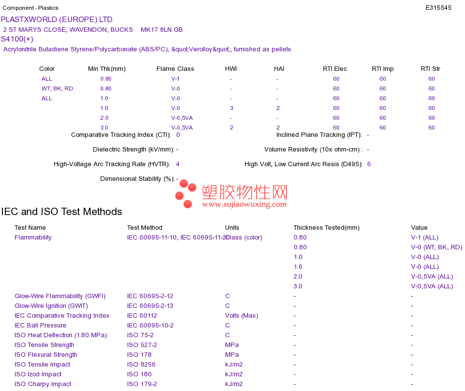 Acrylonitrile Butadiene Styrene/Polycarbonate (ABS/PC) S4100(+)UL黄卡资料请登陆会员后查看,如需电子档资料,请联系客服! 赵生:手机13424755533;QQ:27660005