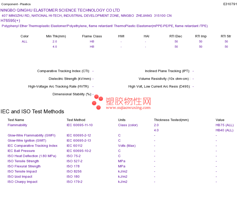 Polyphenyl Ether Thermoplastic Elastomer/Polyethylene H76595(+)UL黄卡资料请登陆会员后查看,如需电子档资料,请联系客服! 赵生:手机13424755533;QQ:27660005