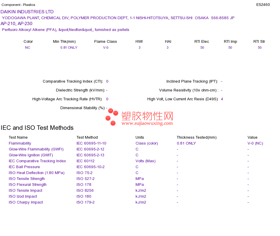 Perfluoro Alkoxyl Alkene (PFA) AP-210, AP-230UL黄卡资料请登陆会员后查看,如需电子档资料,请联系客服! 赵生:手机13424755533;QQ:27660005