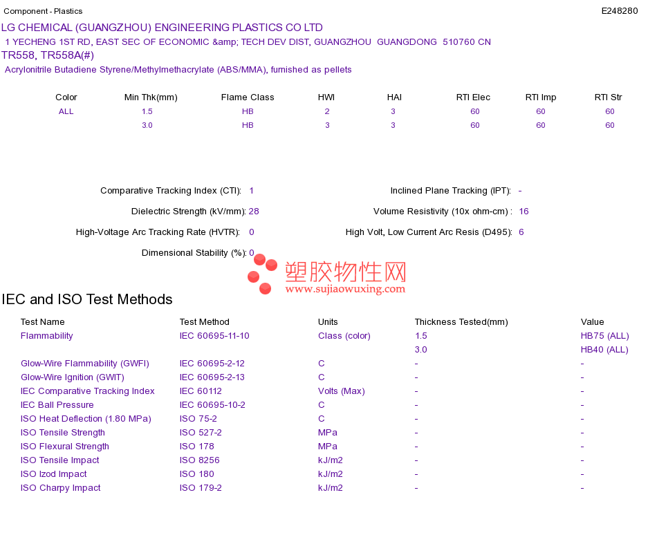 Acrylonitrile Butadiene Styrene/Methylmethacrylate (ABS/MMA) TR558, TR558A(#)UL黄卡资料请登陆会员后查看,如需电子档资料,请联系客服! 赵生:手机13424755533;QQ:27660005