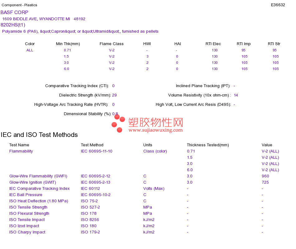 Polyamide 6 (PA6) 8202HS(t1)UL黄卡资料请登陆会员后查看,如需电子档资料,请联系客服! 赵生:手机13424755533;QQ:27660005