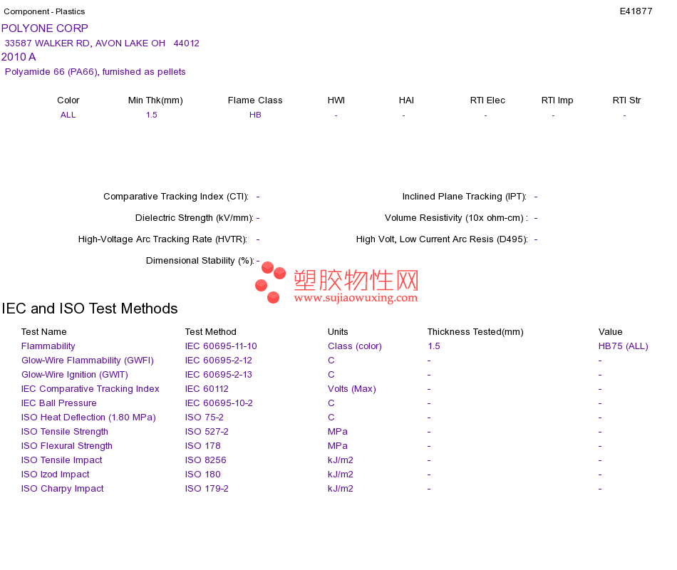 Polyamide 66 (PA66) 2010 A UL黄卡