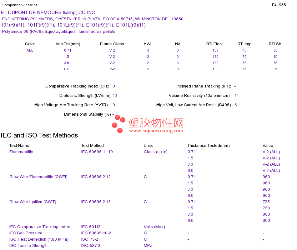 Polyamide 66 (PA66) 101(r9)(f1), 101F(r9)(f1), 101L(r9)(f1), E101(r9)(f1), E101L(r9)(f1)UL黄卡资料请登陆会员后查看,如需电子档资料,请联系客服! 赵生:手机13424755533;QQ:27660005