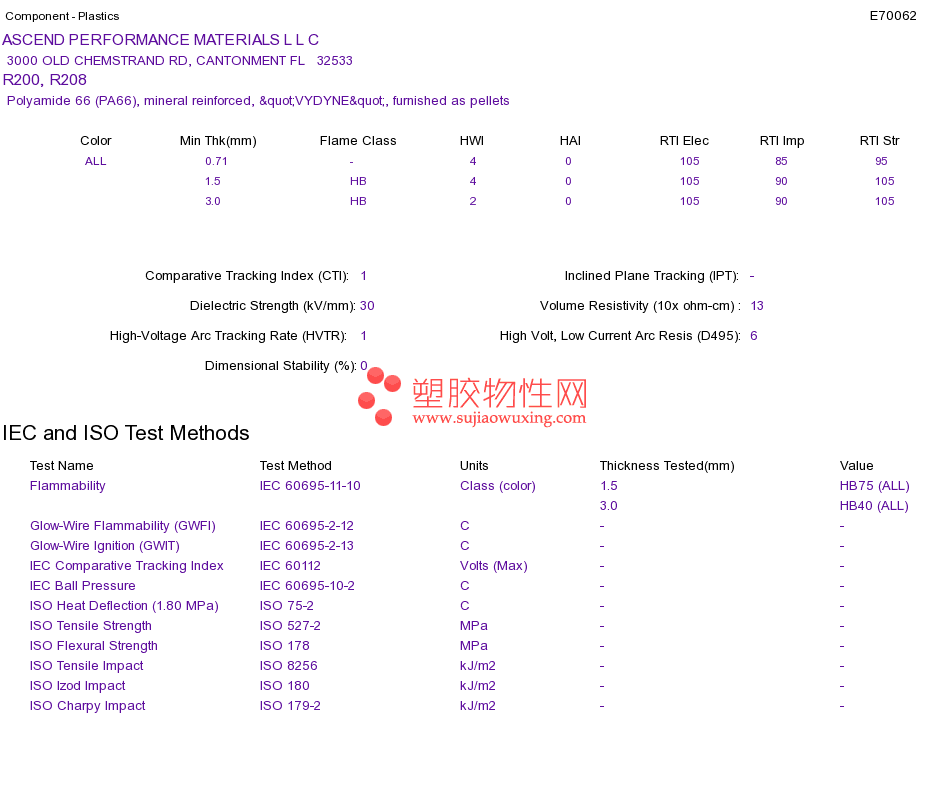 Polyamide 66 (PA66) R200, R208UL黄卡资料请登陆会员后查看,如需电子档资料,请联系客服! 赵生:手机13424755533;QQ:27660005