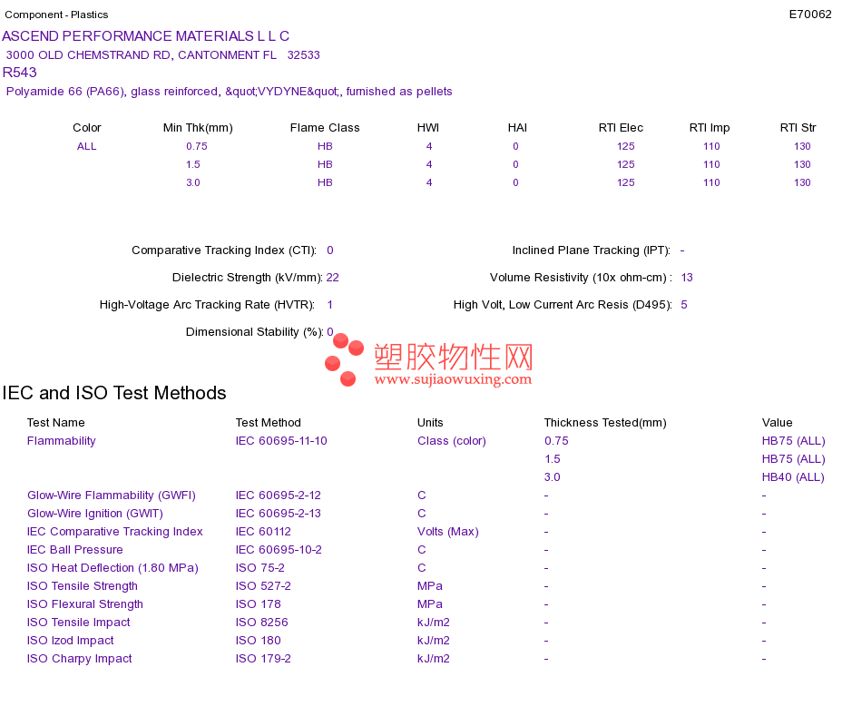 Polyamide 66 (PA66) R543UL黄卡资料请登陆会员后查看,如需电子档资料,请联系客服! 赵生:手机13424755533;QQ:27660005