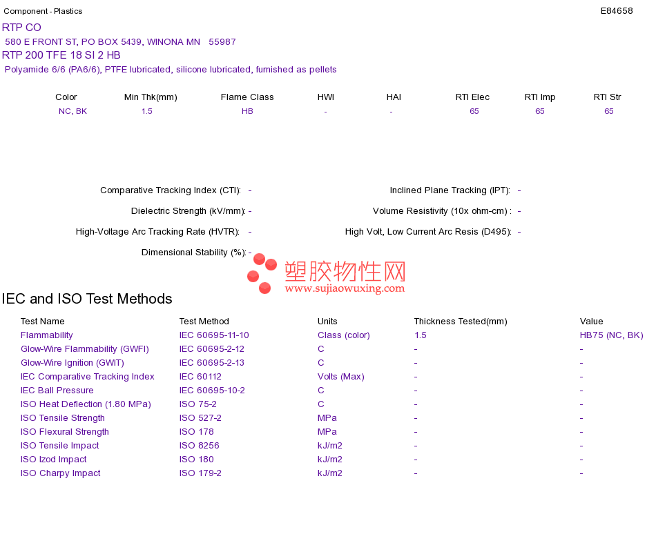 Polyamide 6/6 (PA6/6) RTP 200 TFE 18 SI 2 HB UL黄卡