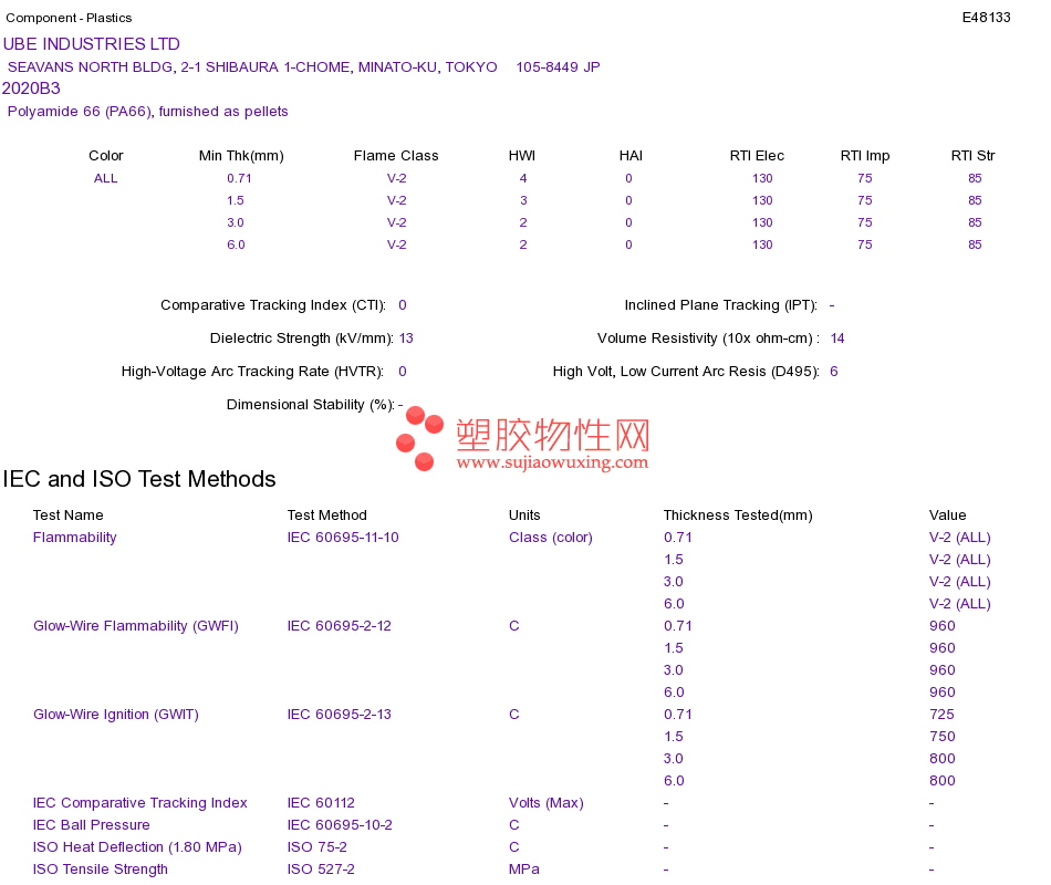 Polyamide 66 (PA66) 2020B3UL黄卡资料请登陆会员后查看,如需电子档资料,请联系客服! 赵生:手机13424755533;QQ:27660005