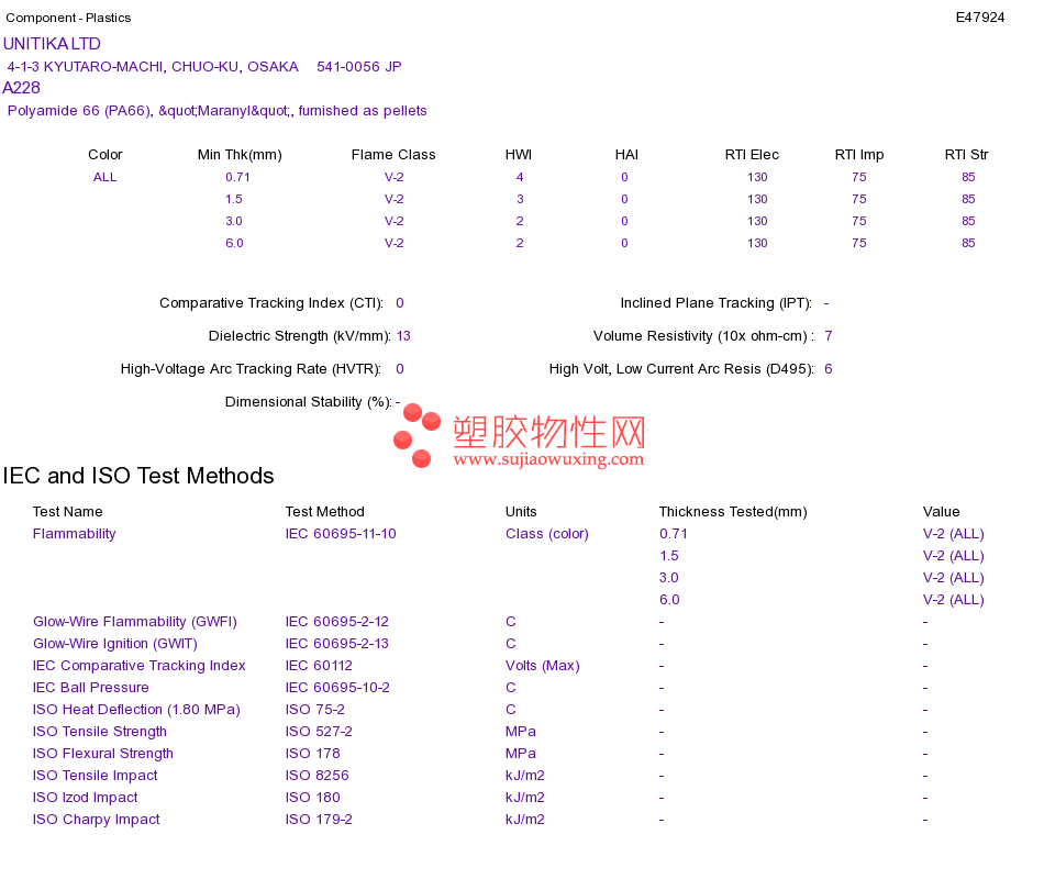Polyamide 66 (PA66) A228UL黄卡资料请登陆会员后查看,如需电子档资料,请联系客服! 赵生:手机13424755533;QQ:27660005