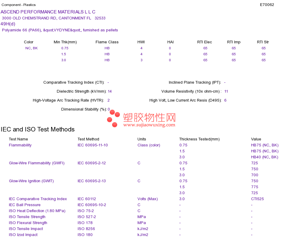 Polyamide 66 (PA66) 49H(d)UL黄卡资料请登陆会员后查看,如需电子档资料,请联系客服! 赵生:手机13424755533;QQ:27660005