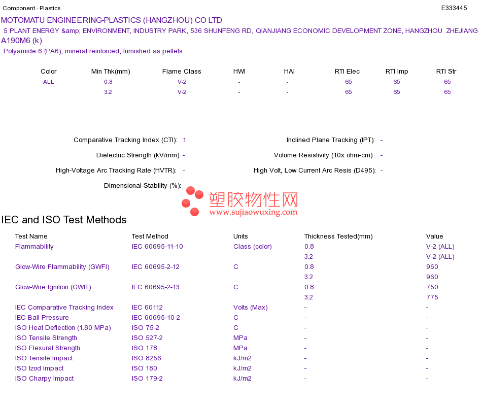 Polyamide 6 (PA6) A190M6 (k)UL黄卡资料请登陆会员后查看,如需电子档资料,请联系客服! 赵生:手机13424755533;QQ:27660005
