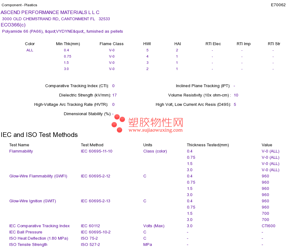 Polyamide 66 (PA66) ECO366(c)UL黄卡资料请登陆会员后查看,如需电子档资料,请联系客服! 赵生:手机13424755533;QQ:27660005