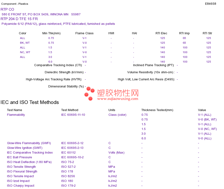 Polyamide 6/12 (PA6/12) RTP 204 D TFE 15 FR UL黄卡
