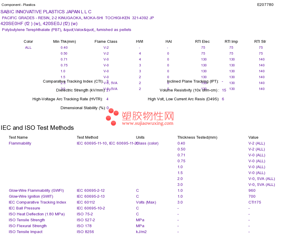 Polybutylene Terephthalate (PBT) 420SE0HF (f2 ) (w), 420SE0J (f2) (w)UL黄卡资料请登陆会员后查看,如需电子档资料,请联系客服! 赵生:手机13424755533;QQ:27660005