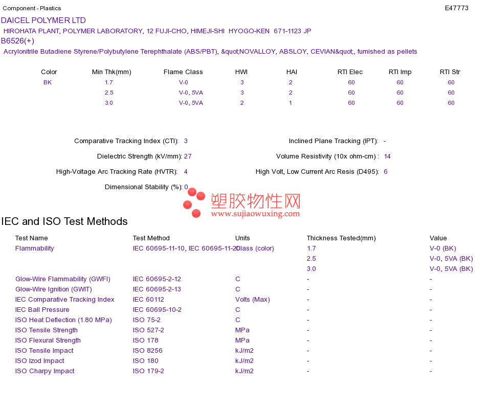 Acrylonitrile Butadiene Styrene/Polybutylene Terephthalate (ABS/PBT) B6526(+)UL黄卡资料请登陆会员后查看,如需电子档资料,请联系客服! 赵生:手机13424755533;QQ:27660005
