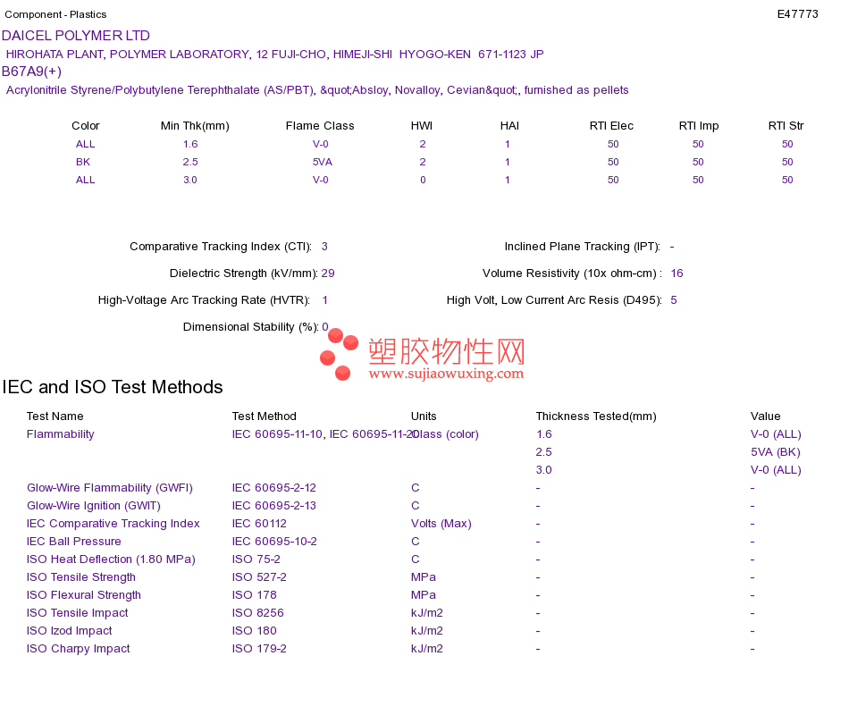 Acrylonitrile Styrene/Polybutylene Terephthalate (AS/PBT) B67A9(+)UL黄卡资料请登陆会员后查看,如需电子档资料,请联系客服! 赵生:手机13424755533;QQ:27660005