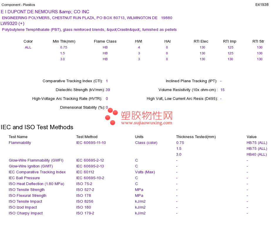 Polybutylene Terephthalate (PBT) LW9320 (+)UL黄卡资料请登陆会员后查看,如需电子档资料,请联系客服! 赵生:手机13424755533;QQ:27660005