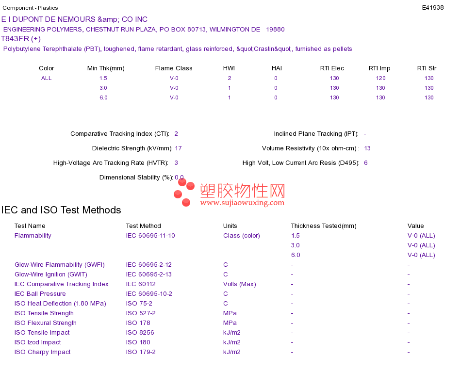 Polybutylene Terephthalate (PBT) T843FR (+)UL黄卡资料请登陆会员后查看,如需电子档资料,请联系客服! 赵生:手机13424755533;QQ:27660005