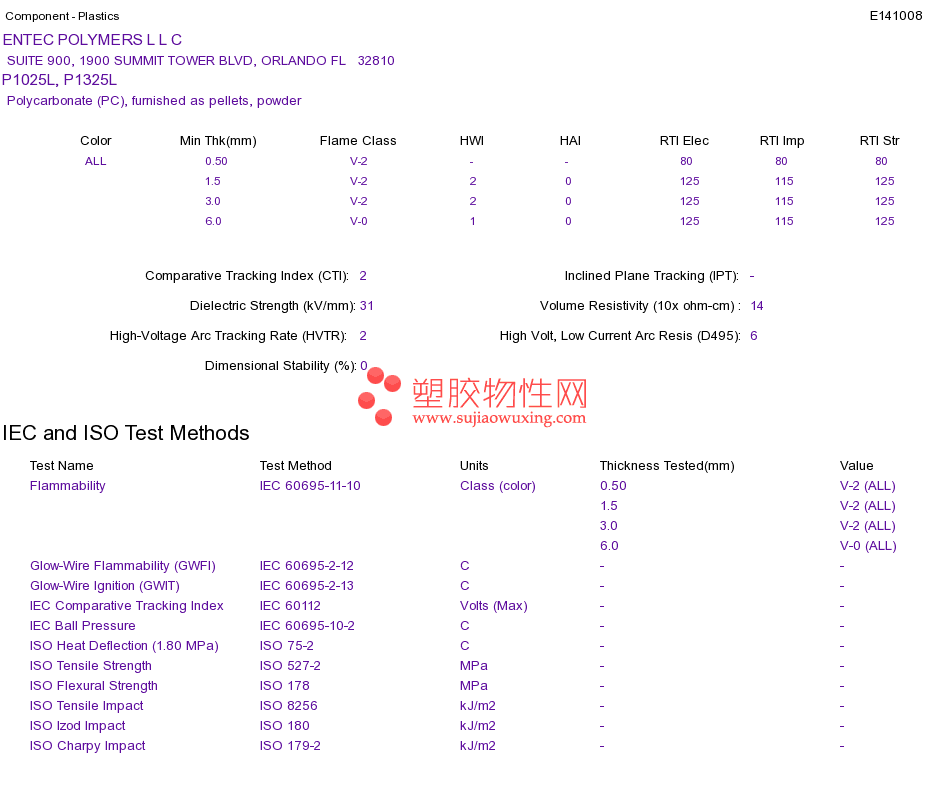 Polycarbonate (PC) P1025L, P1325L UL黄卡