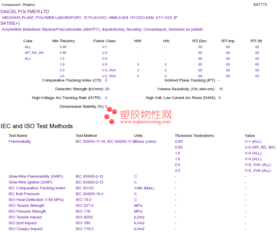 Acrylonitrile Butadiene Styrene/Polycarbonate (ABS/PC) S4100(+)UL黄卡资料请登陆会员后查看,如需电子档资料,请联系客服! 赵生:手机13424755533;QQ:27660005