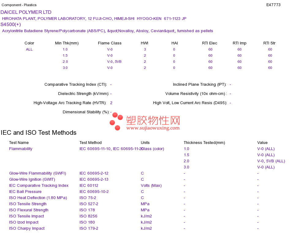 Acrylonitrile Butadiene Styrene/Polycarbonate (ABS/PC) S4500(+)UL黄卡资料请登陆会员后查看,如需电子档资料,请联系客服! 赵生:手机13424755533;QQ:27660005