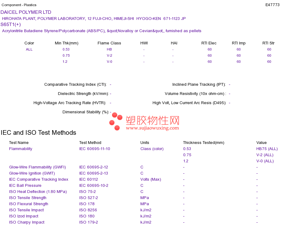 Acrylonitrile Butadiene Styrene/Polycarbonate (ABS/PC) S65T1(+)UL黄卡资料请登陆会员后查看,如需电子档资料,请联系客服! 赵生:手机13424755533;QQ:27660005