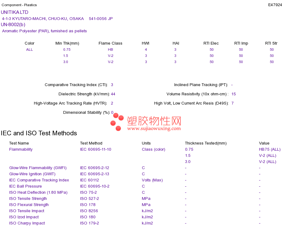 Aromatic Polyester (PAR) UN-8002(b)UL黄卡资料请登陆会员后查看,如需电子档资料,请联系客服! 赵生:手机13424755533;QQ:27660005