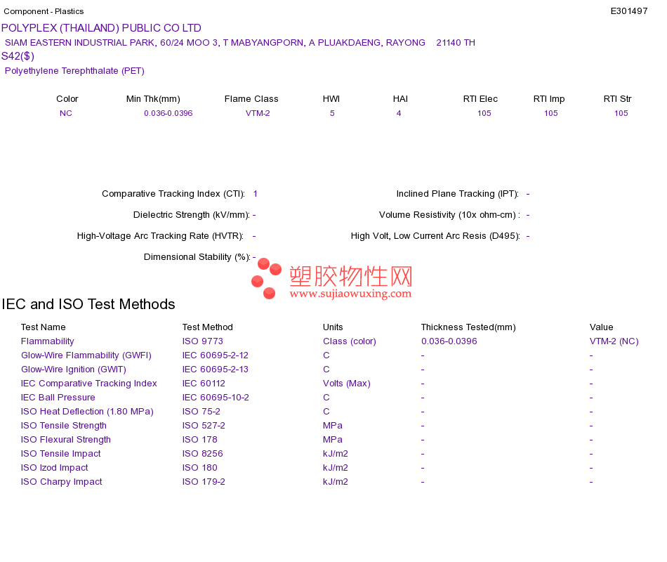 Polyethylene Terephthalate (PET) S42($)UL黄卡资料请登陆会员后查看,如需电子档资料,请联系客服! 赵生:手机13424755533;QQ:27660005