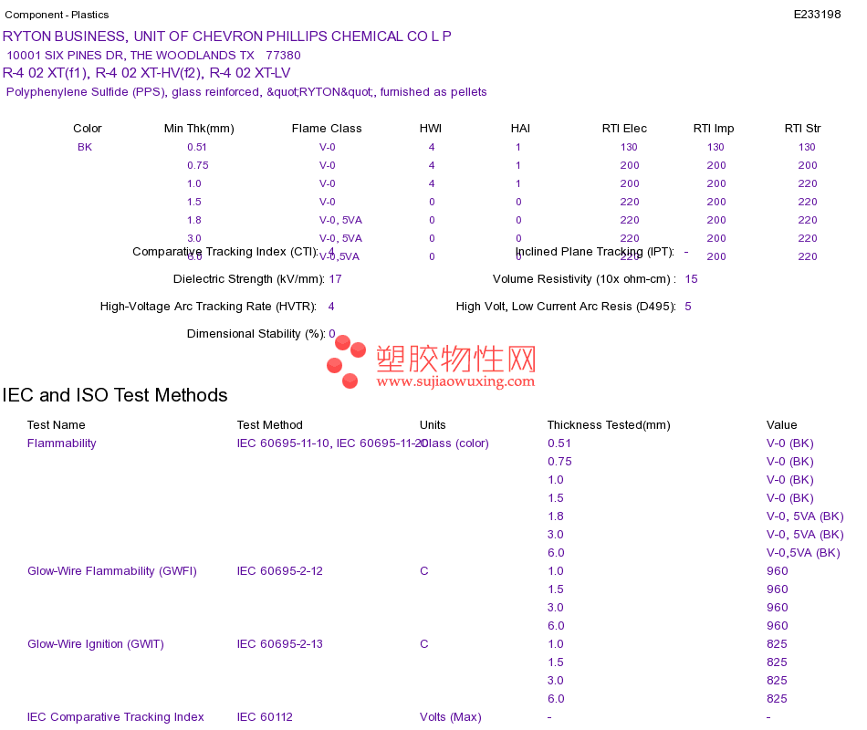 Polyphenylene Sulfide (PPS) R-4 02 XT(f1), R-4 02 XT-HV(f2), R-4 02 XT-LVUL黄卡资料请登陆会员后查看,如需电子档资料,请联系客服! 赵生:手机13424755533;QQ:27660005