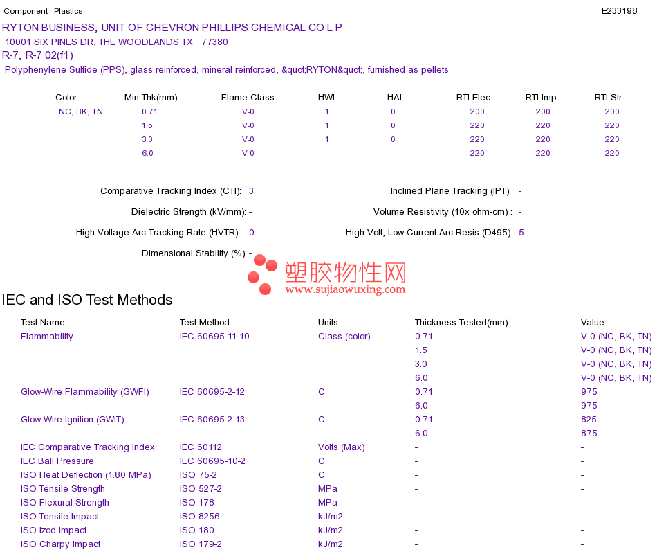 Polyphenylene Sulfide (PPS) R-7, R-7 02(f1) UL黄卡