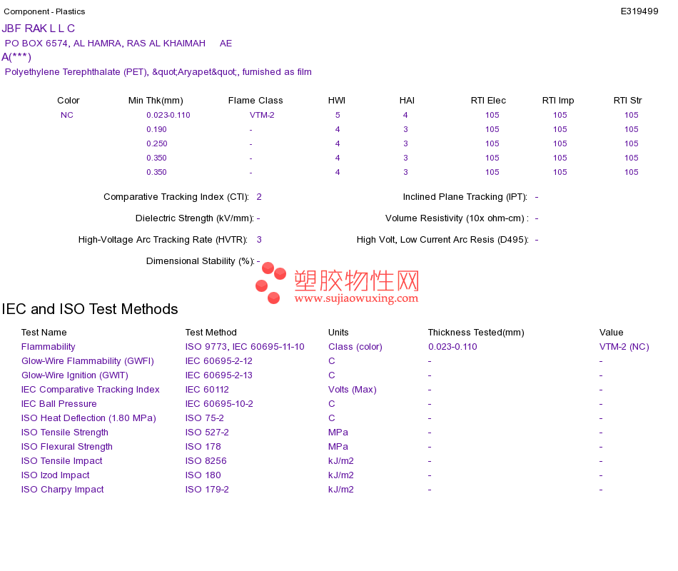 Polyethylene Terephthalate (PET) A(***)UL黄卡资料请登陆会员后查看,如需电子档资料,请联系客服! 赵生:手机13424755533;QQ:27660005