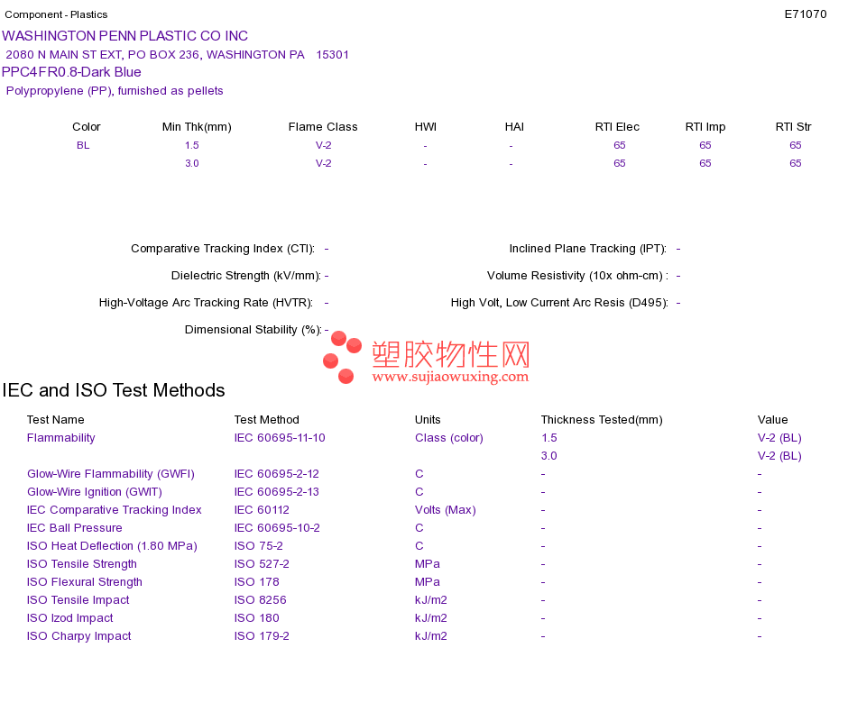 Polypropylene (PP) PPC4FR0.8-Dark BlueUL黄卡资料请登陆会员后查看,如需电子档资料,请联系客服! 赵生:手机13424755533;QQ:27660005
