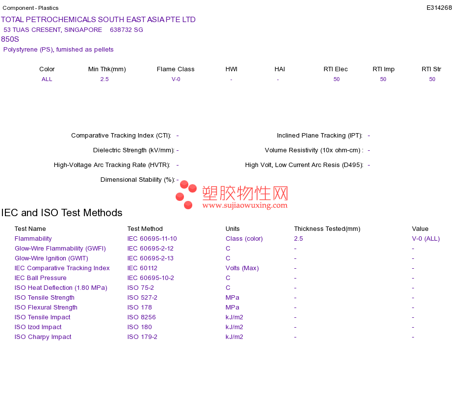 Polystyrene (PS) 850SUL黄卡资料请登陆会员后查看,如需电子档资料,请联系客服! 赵生:手机13424755533;QQ:27660005