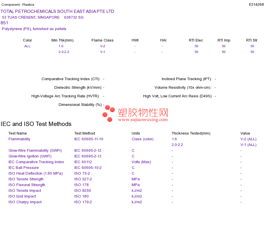 Polystyrene (PS) 851UL黄卡资料请登陆会员后查看,如需电子档资料,请联系客服! 赵生:手机13424755533;QQ:27660005