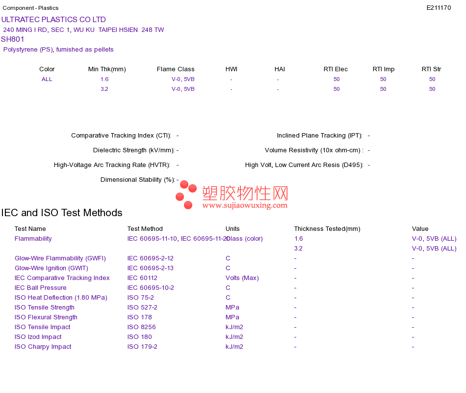 Polystyrene (PS) SH801UL黄卡资料请登陆会员后查看,如需电子档资料,请联系客服! 赵生:手机13424755533;QQ:27660005