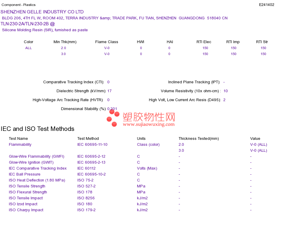 Silicone Molding Resin (SIR) TLN-230-2A/TLN-230-2B @UL黄卡资料请登陆会员后查看,如需电子档资料,请联系客服! 赵生:手机13424755533;QQ:27660005