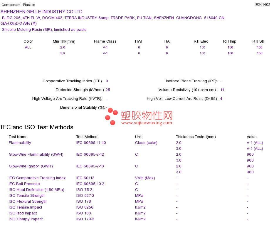 Silicone Molding Resin (SIR) GA-0250-2 A/B (#)UL黄卡资料请登陆会员后查看,如需电子档资料,请联系客服! 赵生:手机13424755533;QQ:27660005