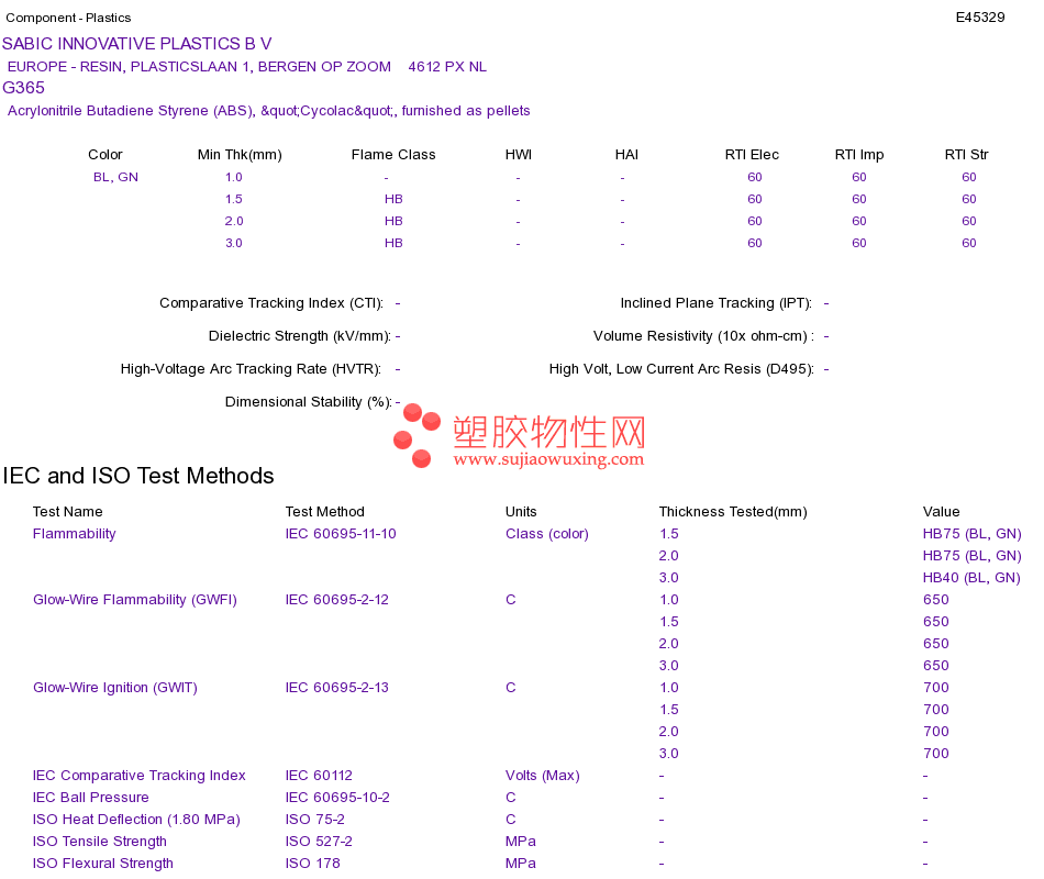 Acrylonitrile Butadiene Styrene (ABS) G365UL黄卡资料请登陆会员后查看,如需电子档资料,请联系客服! 赵生:手机13424755533;QQ:27660005