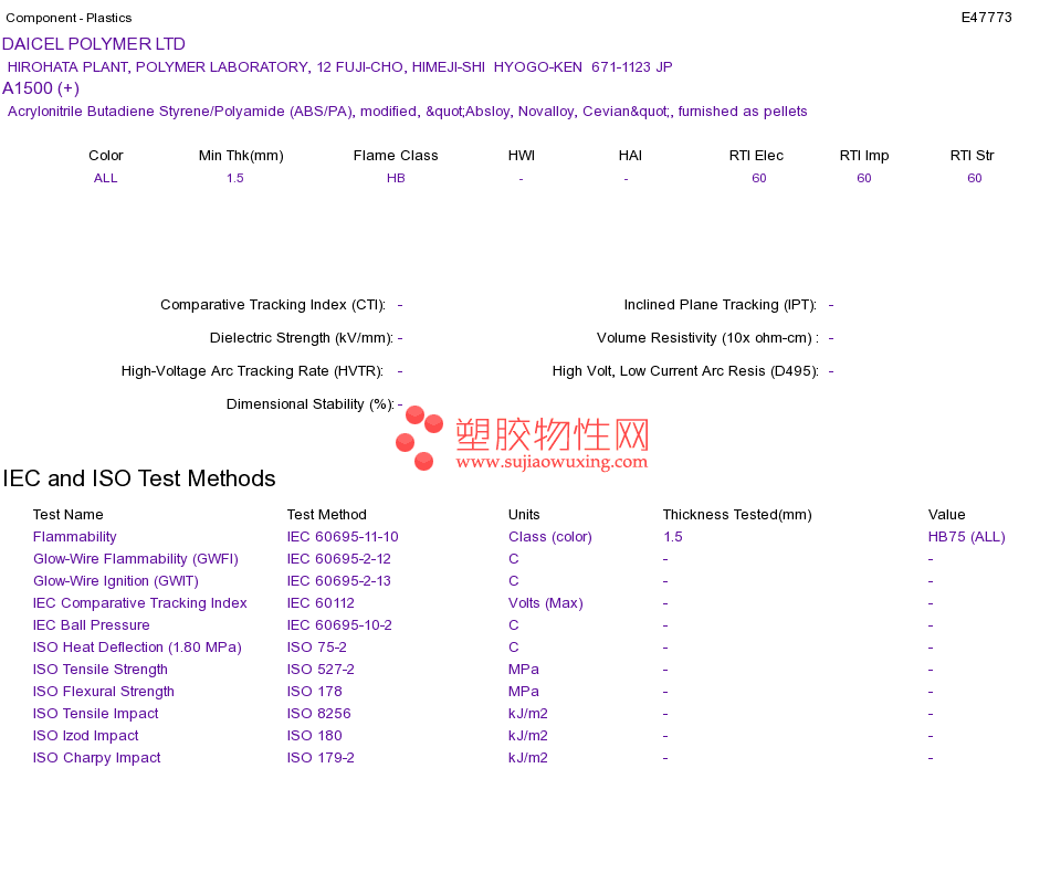 Acrylonitrile Butadiene Styrene/Polyamide (ABS/PA) A1500 (+)UL黄卡资料请登陆会员后查看,如需电子档资料,请联系客服! 赵生:手机13424755533;QQ:27660005