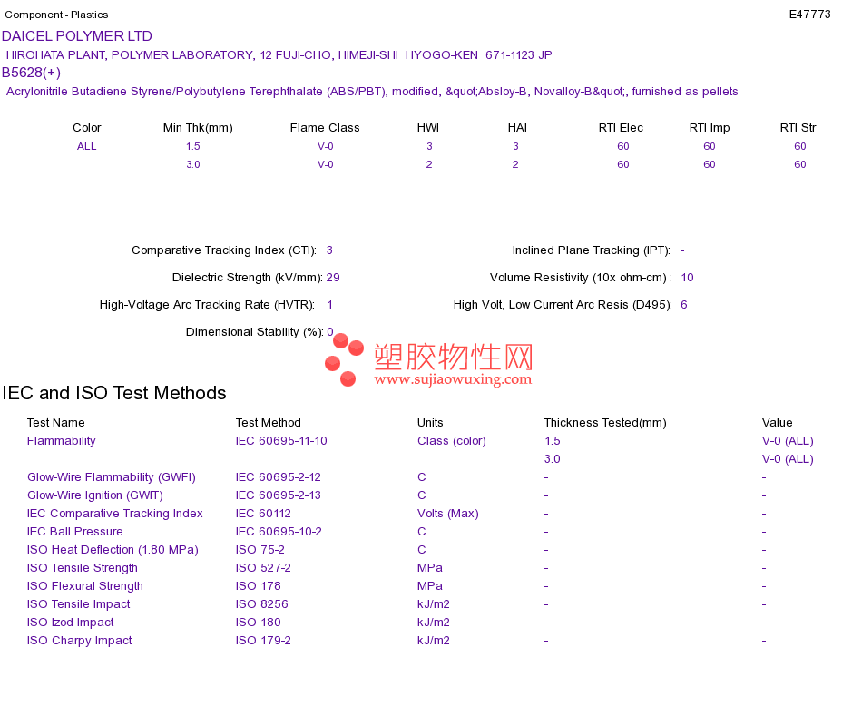 Acrylonitrile Butadiene Styrene/Polybutylene Terephthalate (ABS/PBT) B5628(+)UL黄卡资料请登陆会员后查看,如需电子档资料,请联系客服! 赵生:手机13424755533;QQ:27660005