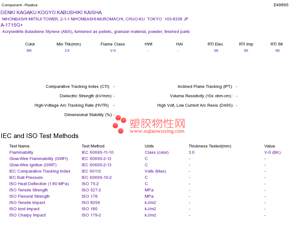 Acrylonitrile Butadiene Styrene (ABS) A-1715G+UL黄卡资料请登陆会员后查看,如需电子档资料,请联系客服! 赵生:手机13424755533;QQ:27660005