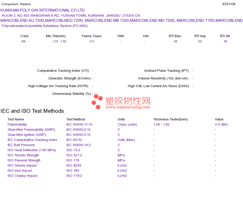 Polycarbonate/Acrylonitrile Butadiene Styrene (PC/ABS) MARCOBLEND AU 7200,MARCOBLNED 7200, MARCOBLEND MB 7200,MARCOBLEND MD 7200, MARCOBLEND 7100,MARCOBLEND AU 7100, MARCOBLEND MD7100,MARCOBLEND MB 7100.UL黄卡资料请登陆会员后查看,如需电子档资料,请联系客服! 赵生:手机13424755533;QQ:27660005