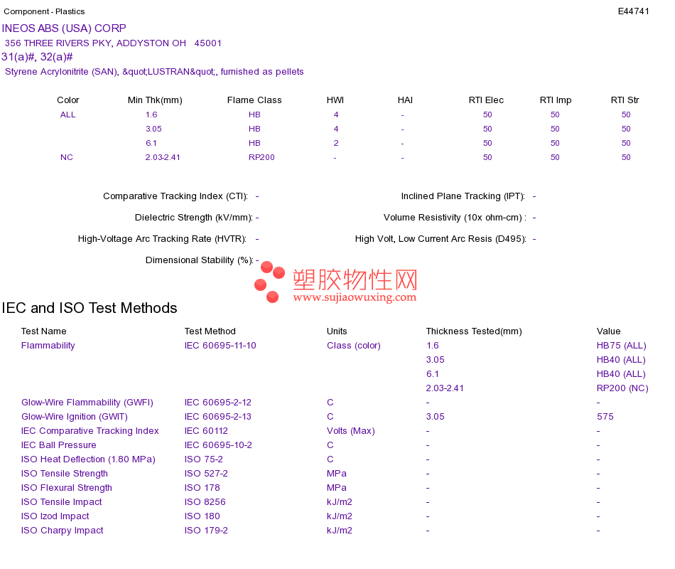 Styrene Acrylonitrite (SAN) 31(a)#, 32(a)#UL黄卡资料请登陆会员后查看,如需电子档资料,请联系客服! 赵生:手机13424755533;QQ:27660005