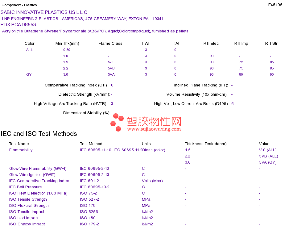 Acrylonitrile Butadiene Styrene/Polycarbonate (ABS/PC) PDX-PCA-98553UL黄卡资料请登陆会员后查看,如需电子档资料,请联系客服! 赵生:手机13424755533;QQ:27660005