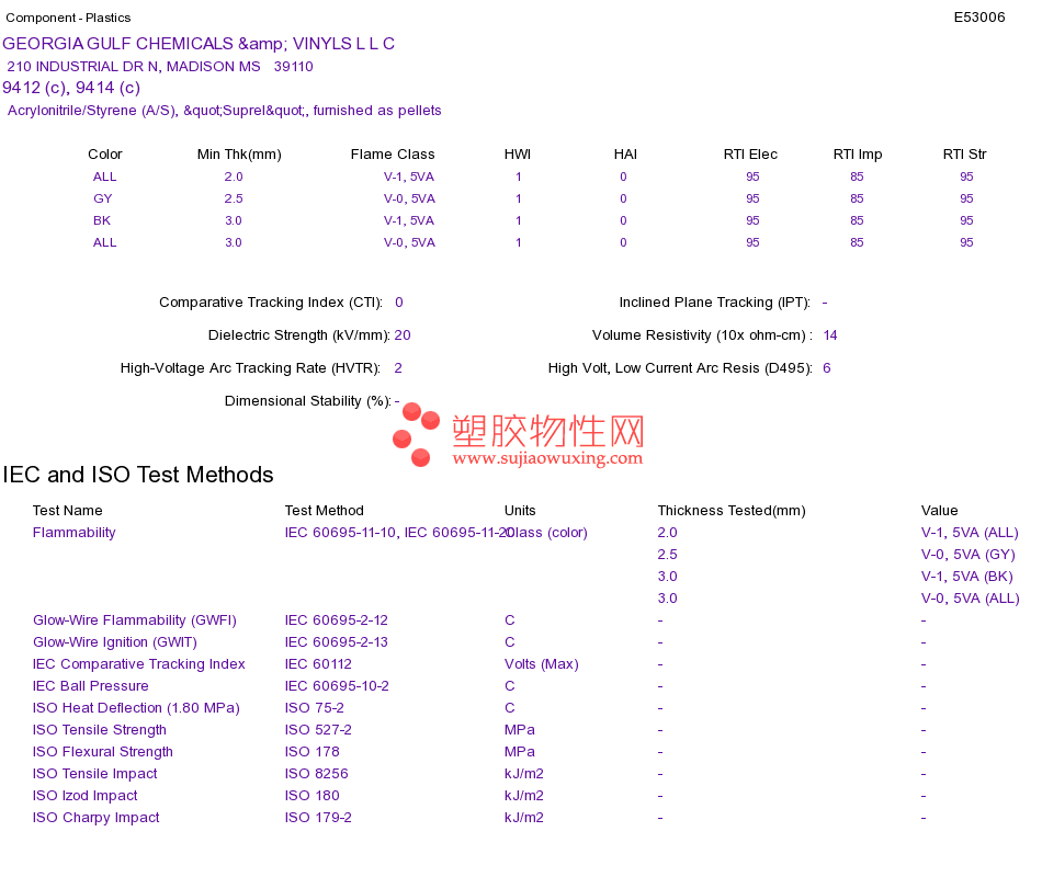 Acrylonitrile/Styrene (A/S) 9412 (c), 9414 (c)UL黄卡资料请登陆会员后查看,如需电子档资料,请联系客服! 赵生:手机13424755533;QQ:27660005