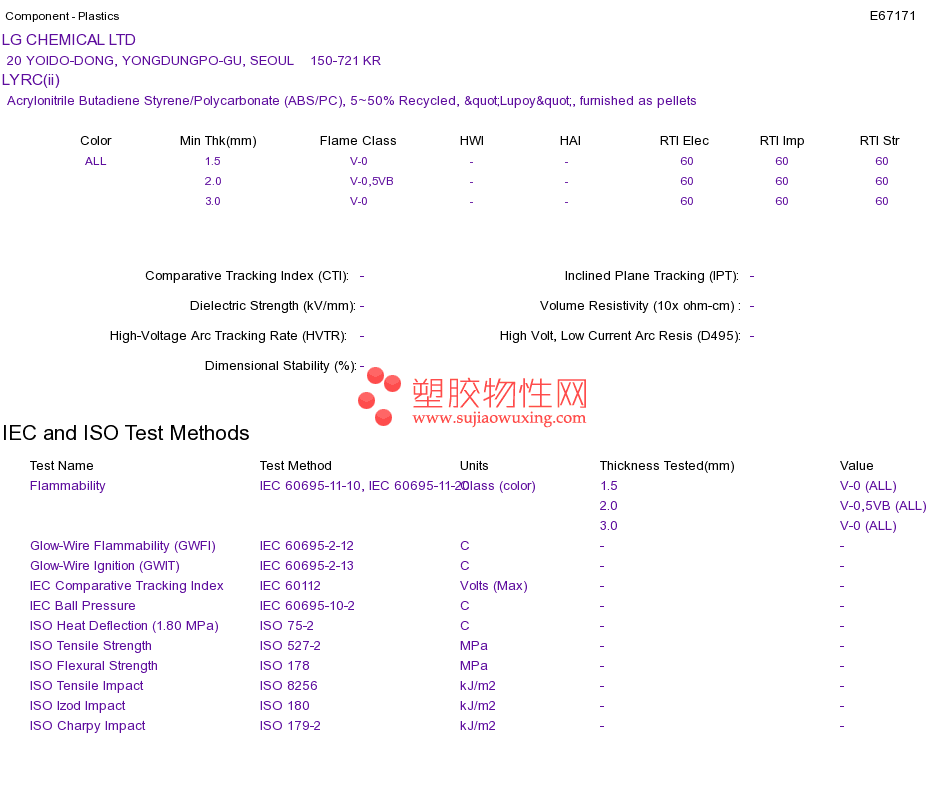 Acrylonitrile Butadiene Styrene/Polycarbonate (ABS/PC) LYRC(ii)UL黄卡资料请登陆会员后查看,如需电子档资料,请联系客服! 赵生:手机13424755533;QQ:27660005