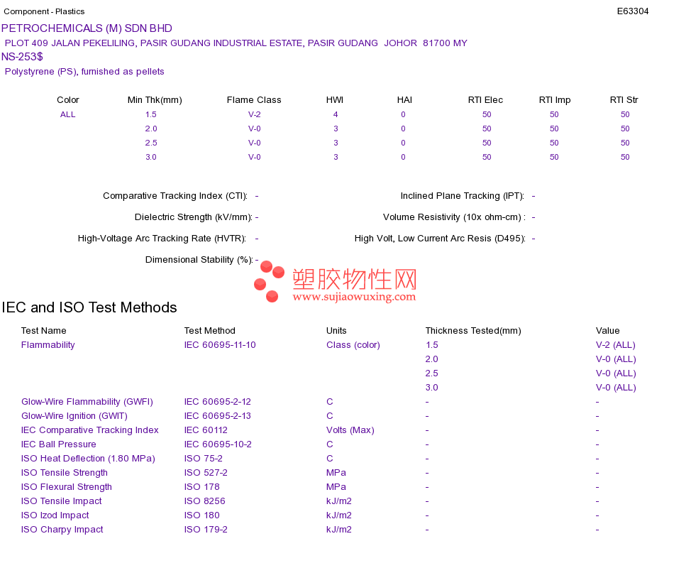 Polystyrene (PS) NS-253$UL黄卡资料请登陆会员后查看,如需电子档资料,请联系客服! 赵生:手机13424755533;QQ:27660005