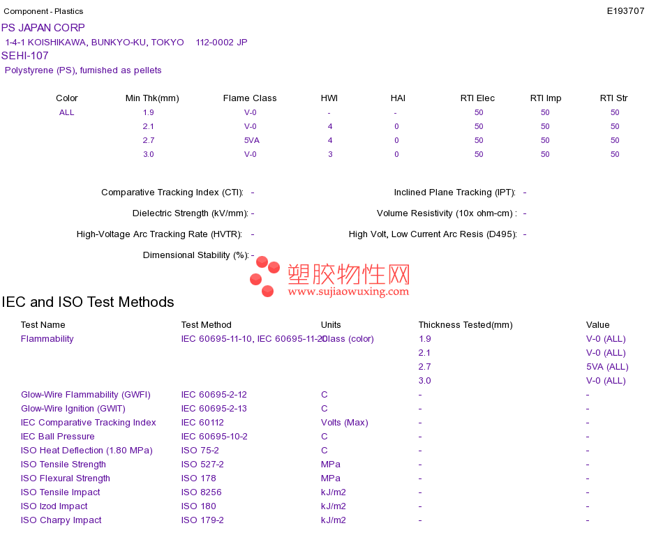 Polystyrene (PS) SEHI-107UL黄卡资料请登陆会员后查看,如需电子档资料,请联系客服! 赵生:手机13424755533;QQ:27660005